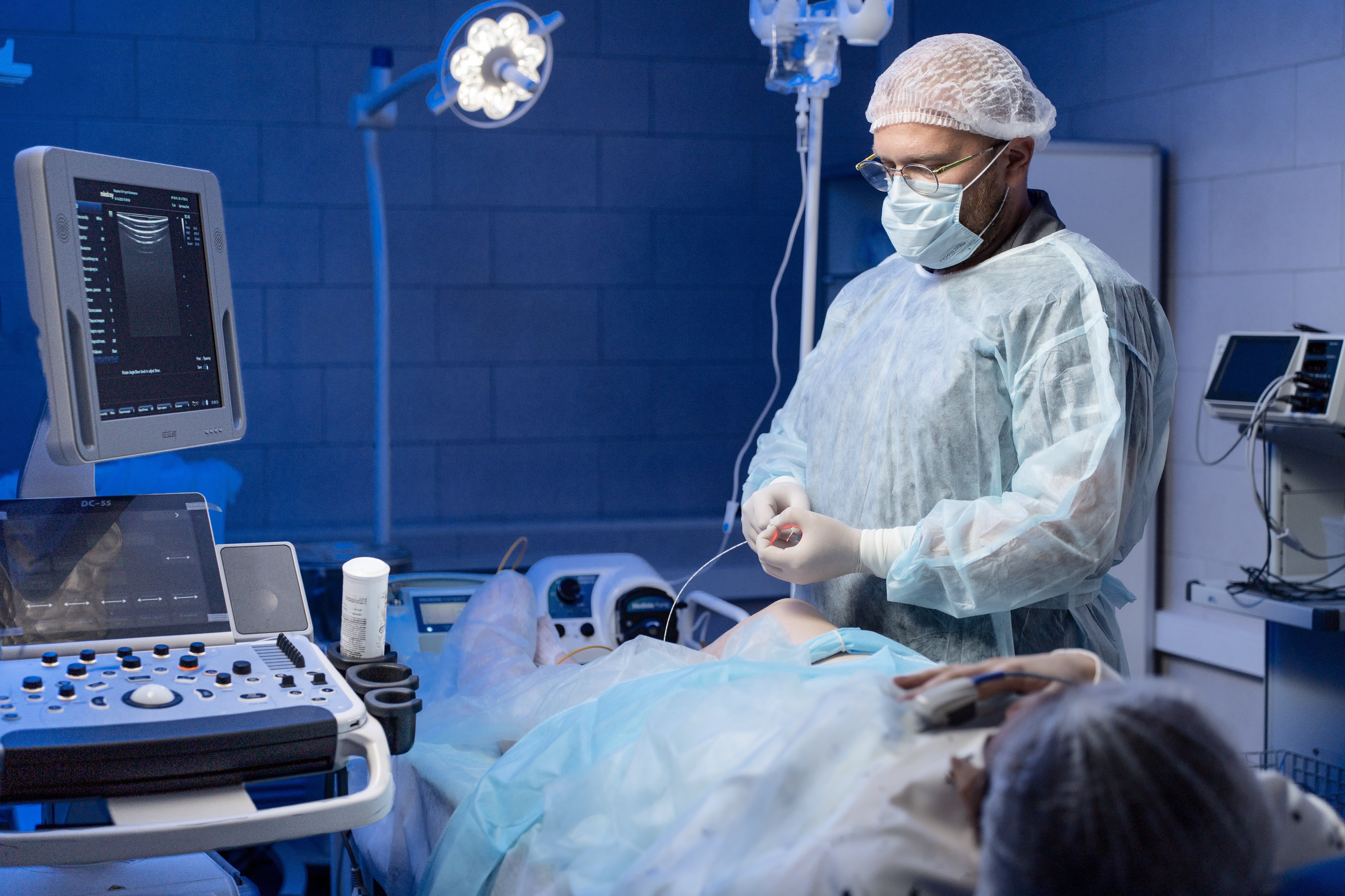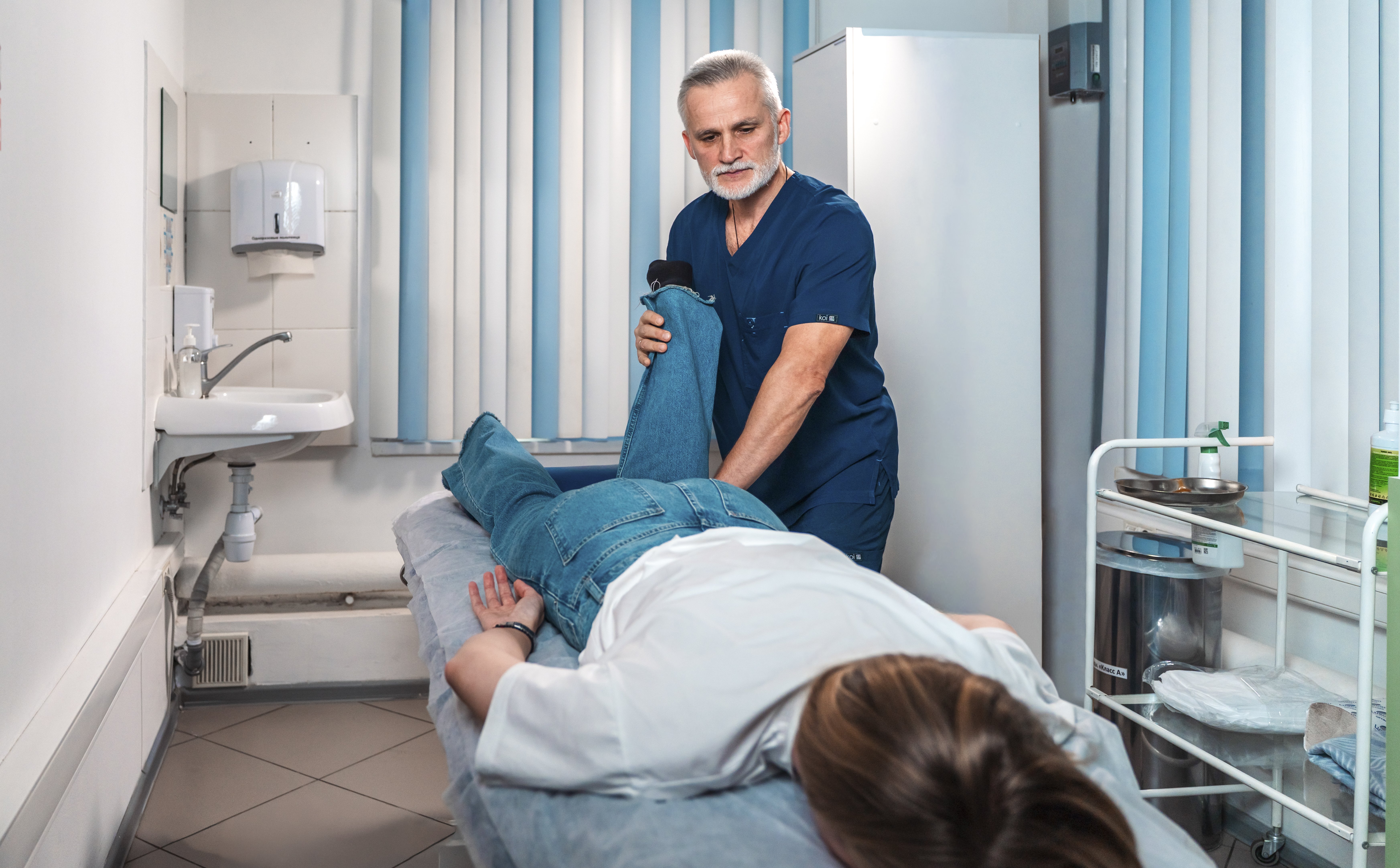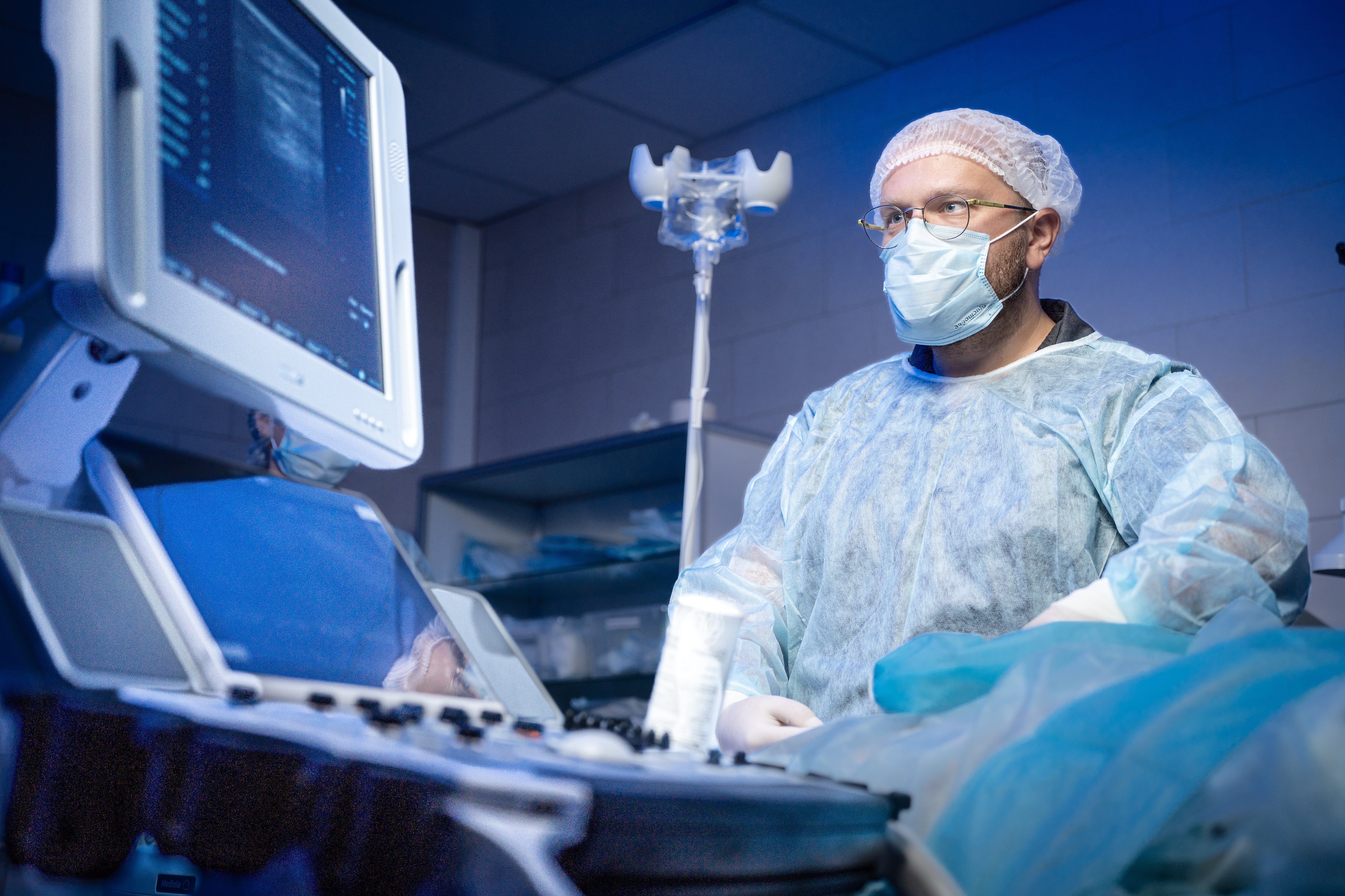 Врач сердечно-сосудистый хирург, флеболог, колопроктолог Кислицин А.Ю. выполняет ультразвуковое исследование вен нижних конечностей